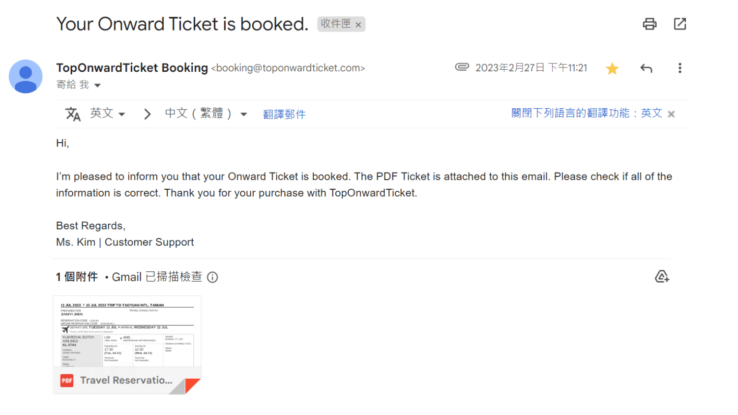 - 在他們的辦公時間內,機票訂位紀錄會以PDF檔的形式,在5~60分鐘內寄到你所填寫的信箱。