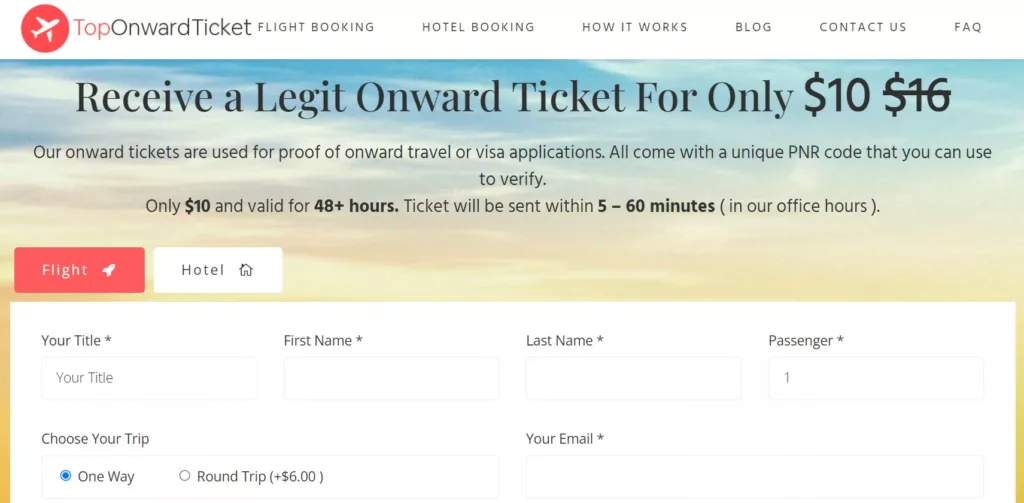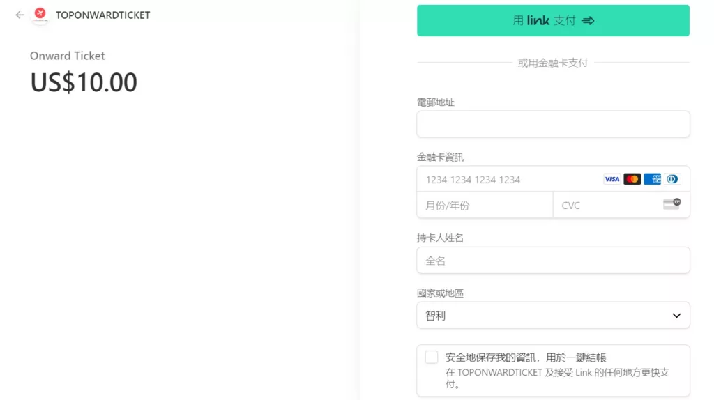 只要在Onward Ticket上,輸入出發地與目的地、乘客名字及收件信箱,並線上刷卡美金16元後,就可以購買到某個航空公司、含有PNR代碼的「航班訂位紀錄」。
